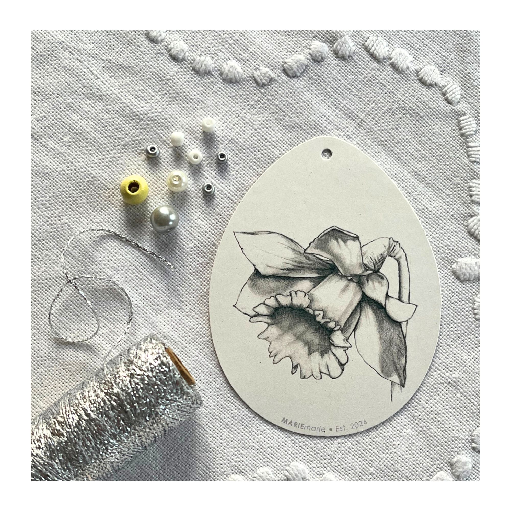 - 1 påskeæg med håndtegnet motiv af påskelilje med print på begge sider (100% genanvendt, kraftigt papir)