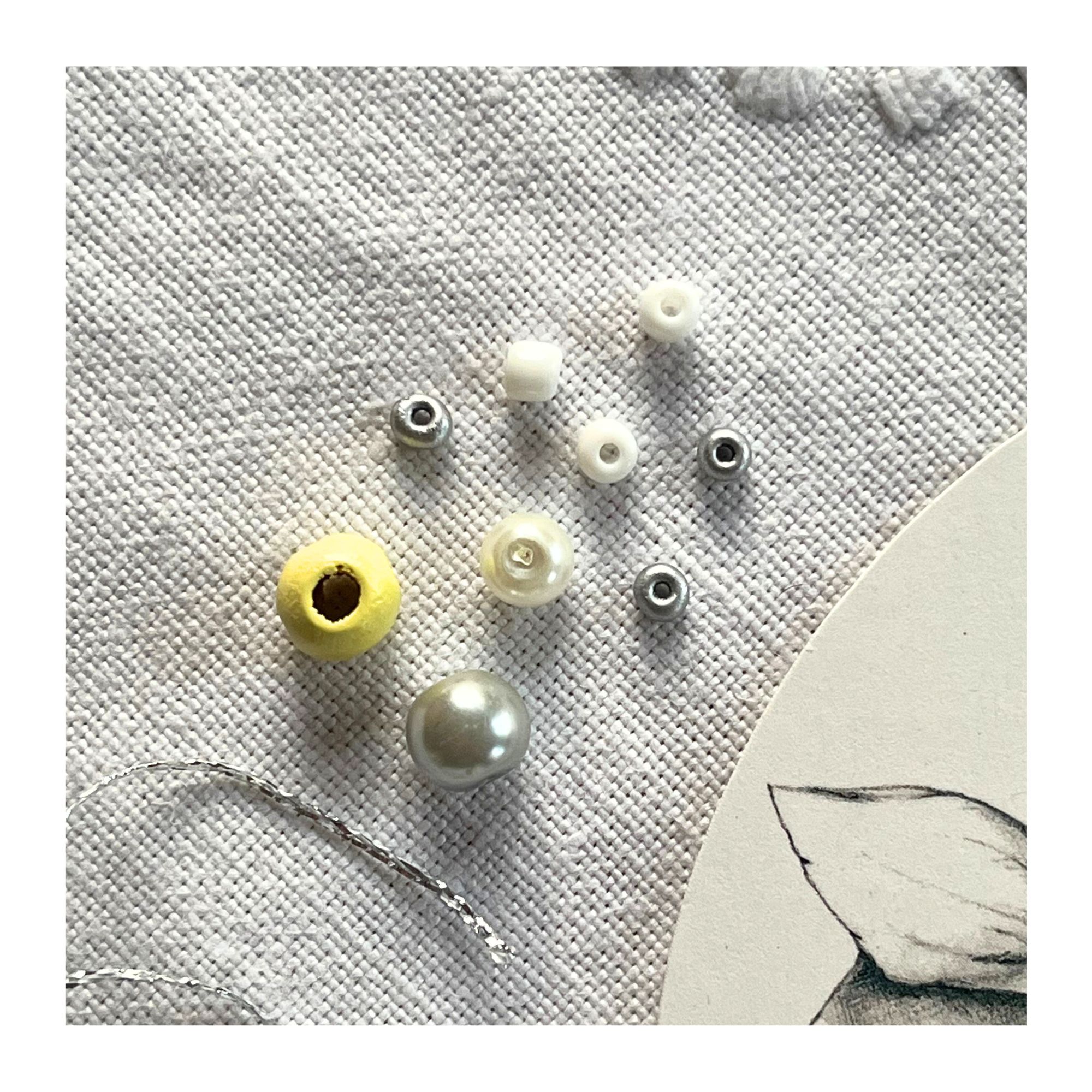 - Blandede hvide og sølvfarvede glasperler og en gul træperle