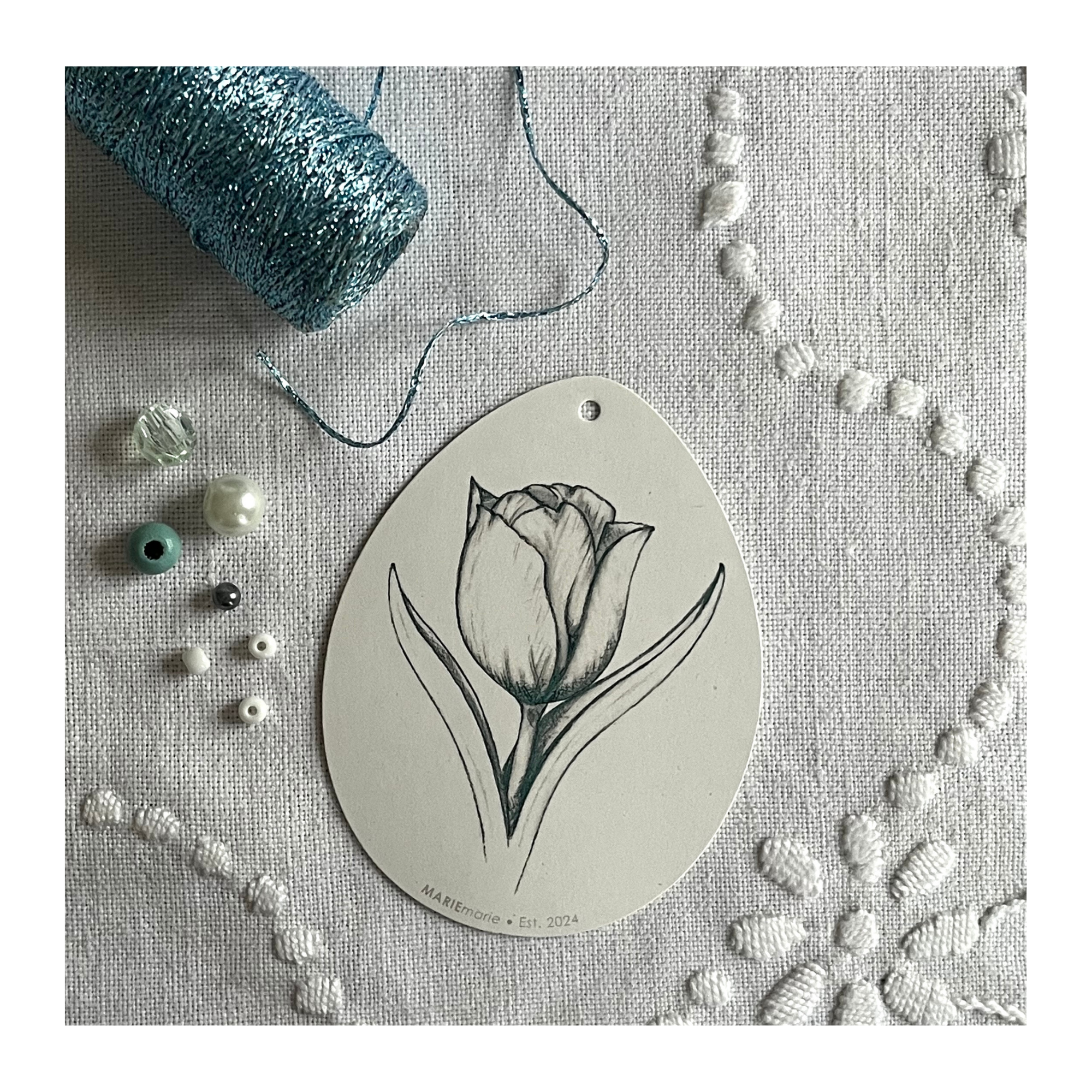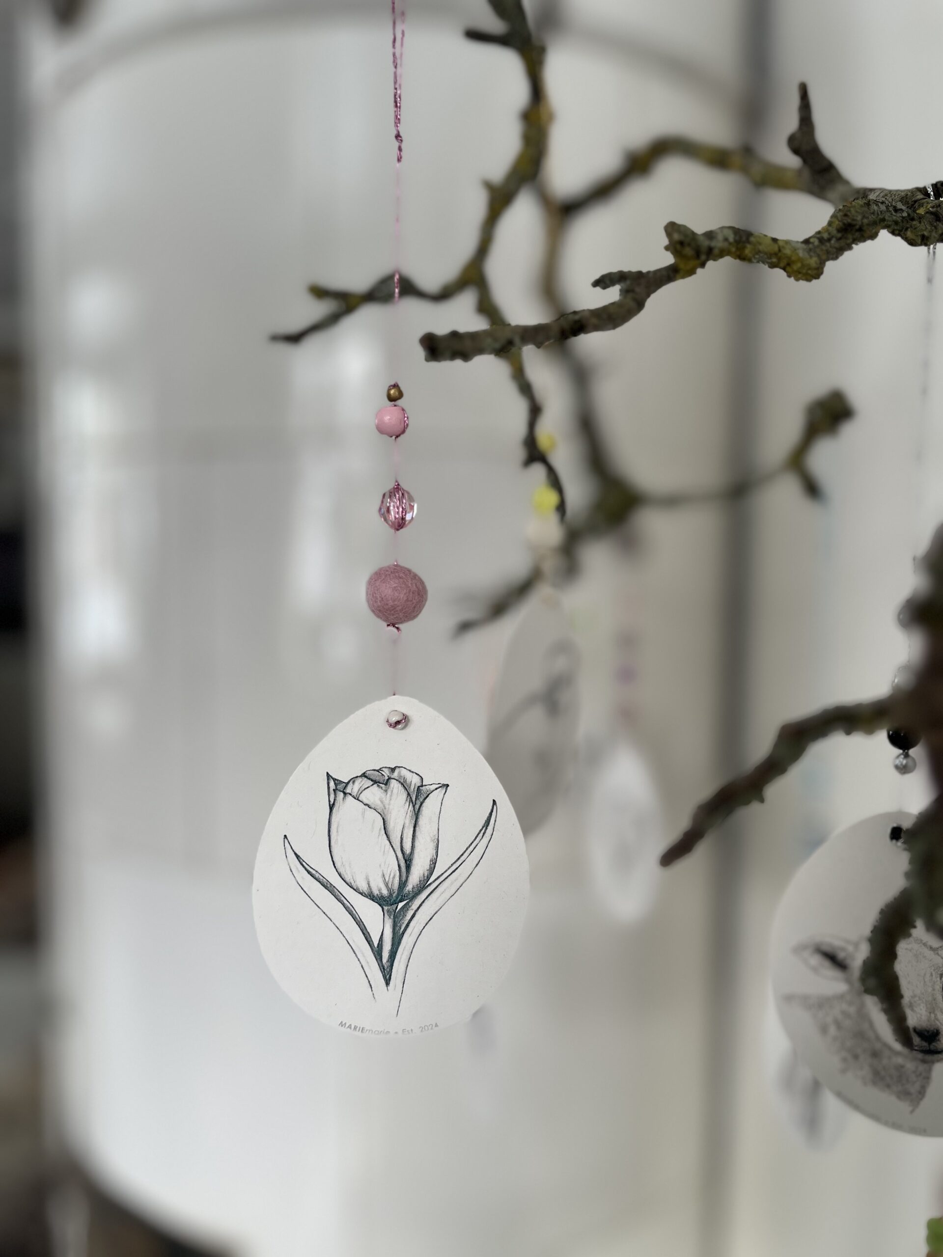 - 1 påskeæg med håndtegnet motiv af tulipan med print på begge sider (100% genanvendt, kraftigt papir)