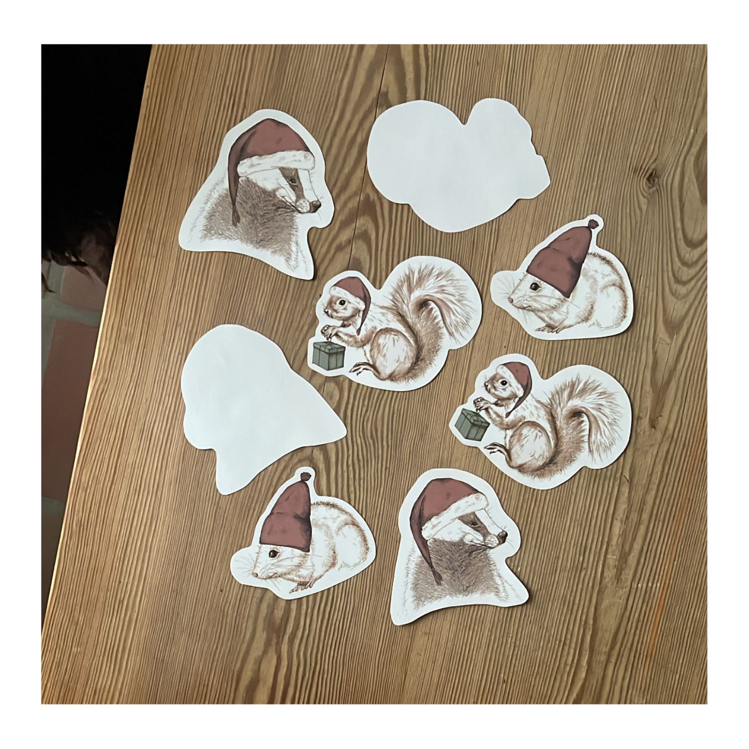 Da vi fik vores julekort hjem, var tre af motiverne trykt på en for tynd papirtykkelse, som ikke kunne bruges som kort. Men papiret fejler jo ikke noget! Derfor har vi klippet dem ud og sælger dem billigt som gavemærker, der kan pynte på julegaverne.