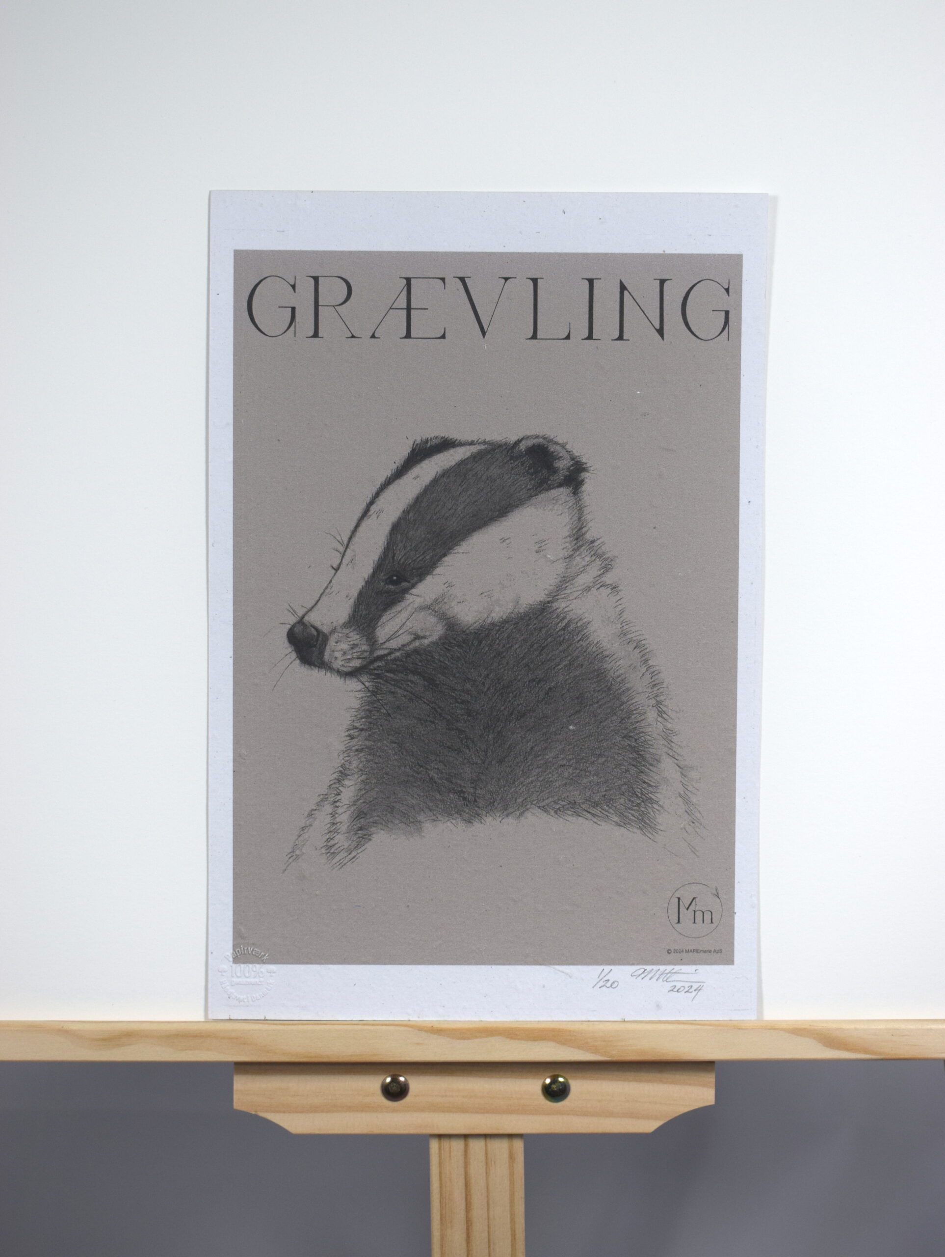 Limited edition kunsttryk af håndtegnet motiv: “Grævling”. Str. ca. A4 (ca. 21 x 29,7 cm).*