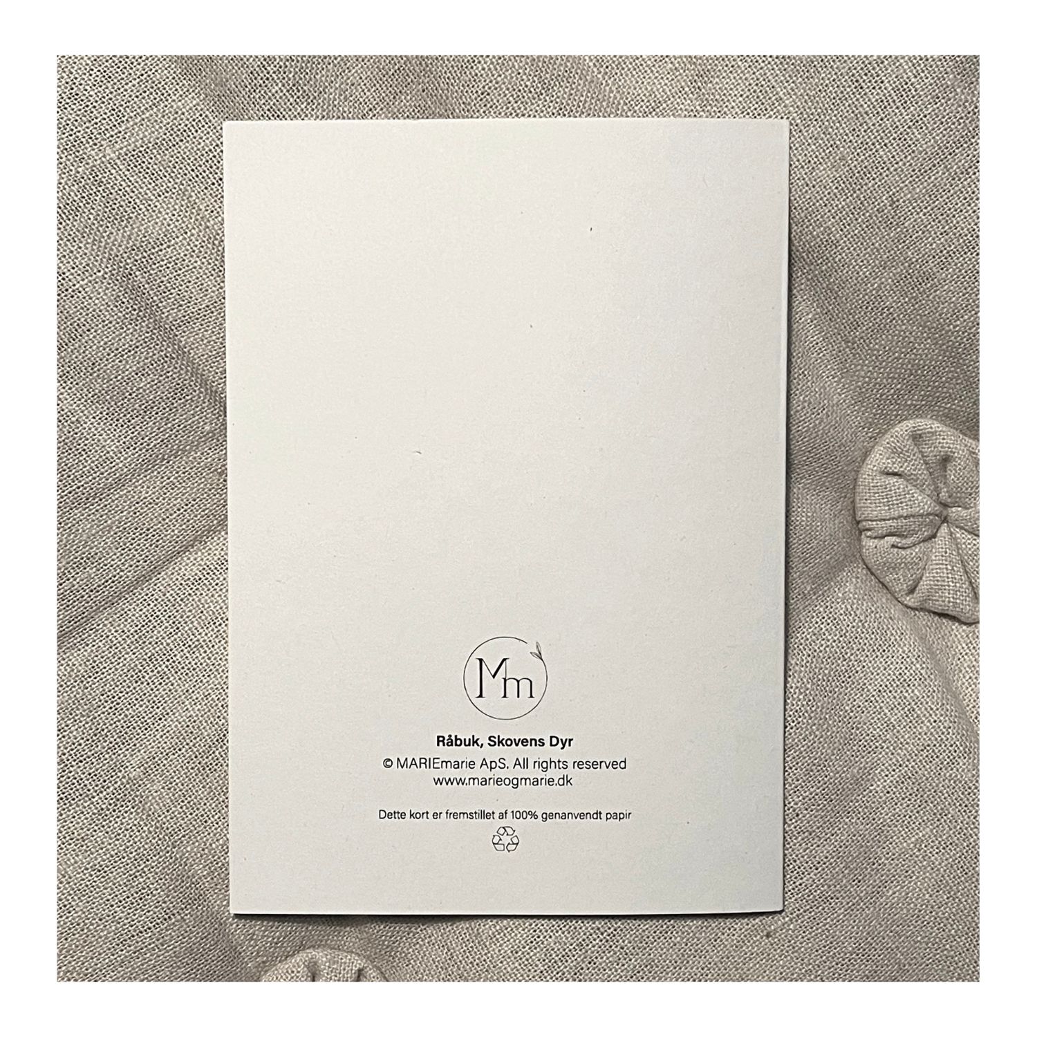 Julekort med håndtegnet motiv: “Julebuk” (Råbuk m. nissehue og julegave). Str. A6 (10,5 x 14,8 cm). Inkl. kuvert.