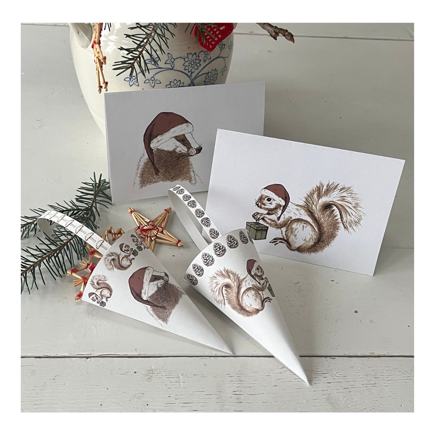 Julekort med håndtegnet motiv: “Julegrævling” (Grævling m. nissehue). Str. A6 (10,5 x 14,8 cm). Inkl. kuvert.