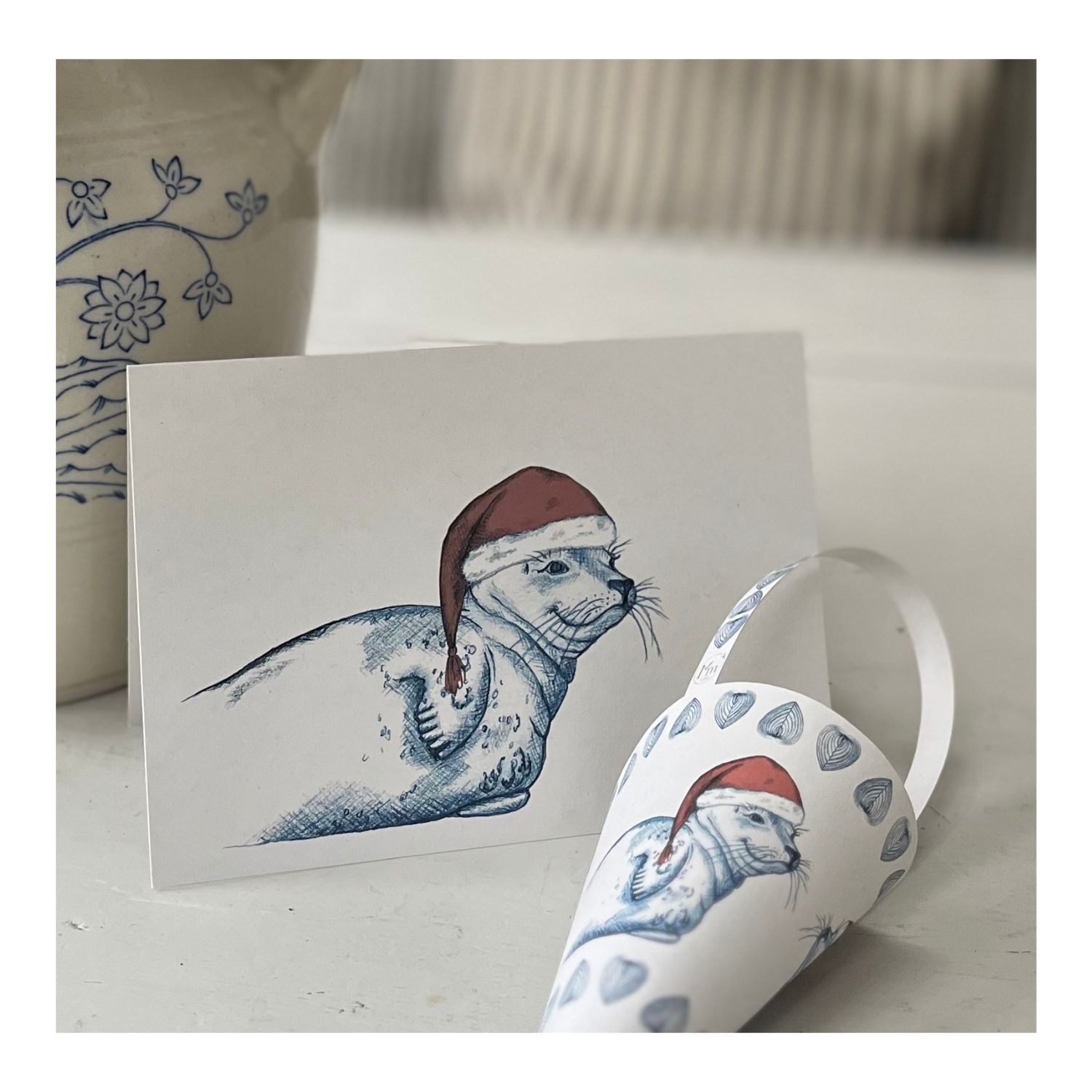 Julekort med håndtegnet motiv: “Julesæl” (Sæl m. nissehue). Str. A6 (10,5 x 14,8 cm). Inkl. kuvert.