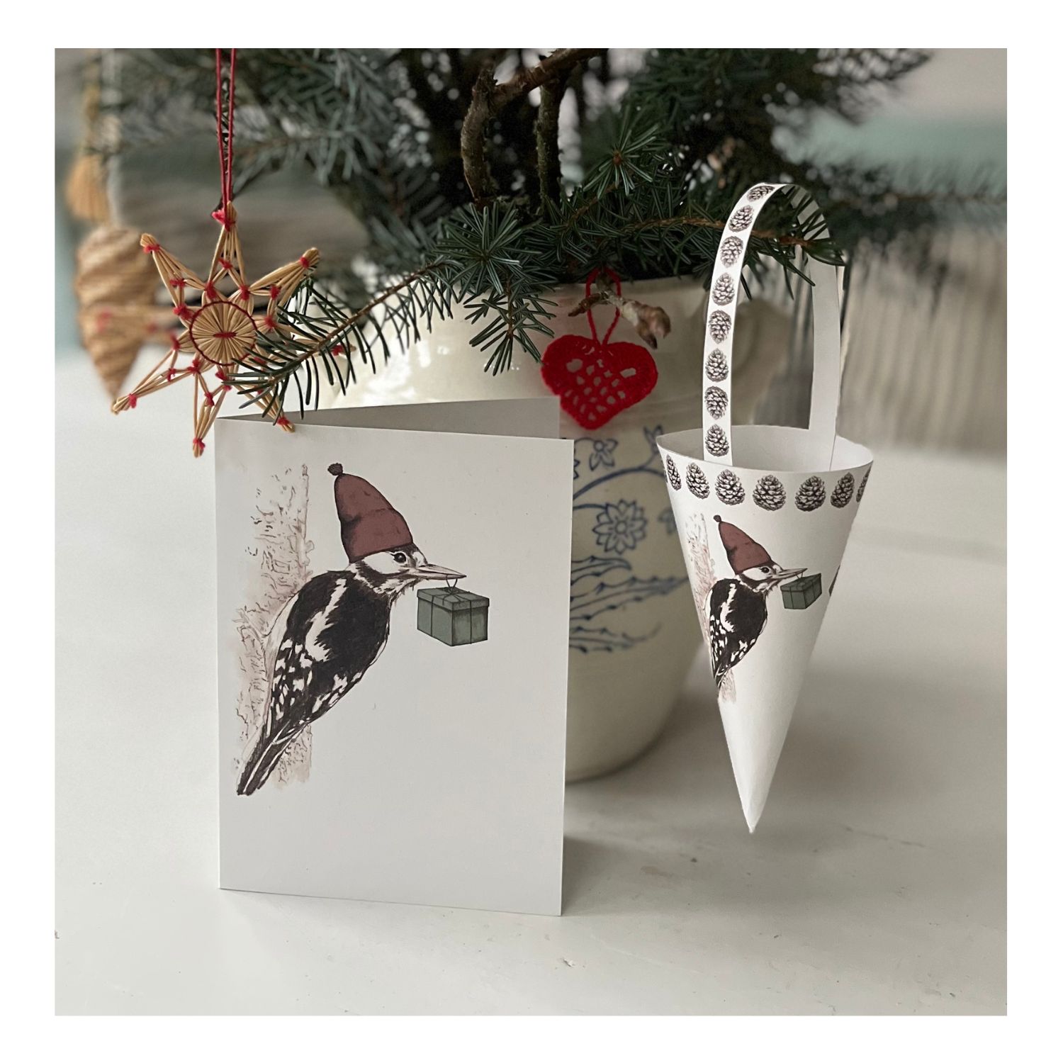 Julekort med håndtegnet motiv: “Julespætte” (Flagspætte m. nissehue og julegave). Str. A6 (10,5 x 14,8 cm). Inkl. kuvert.
