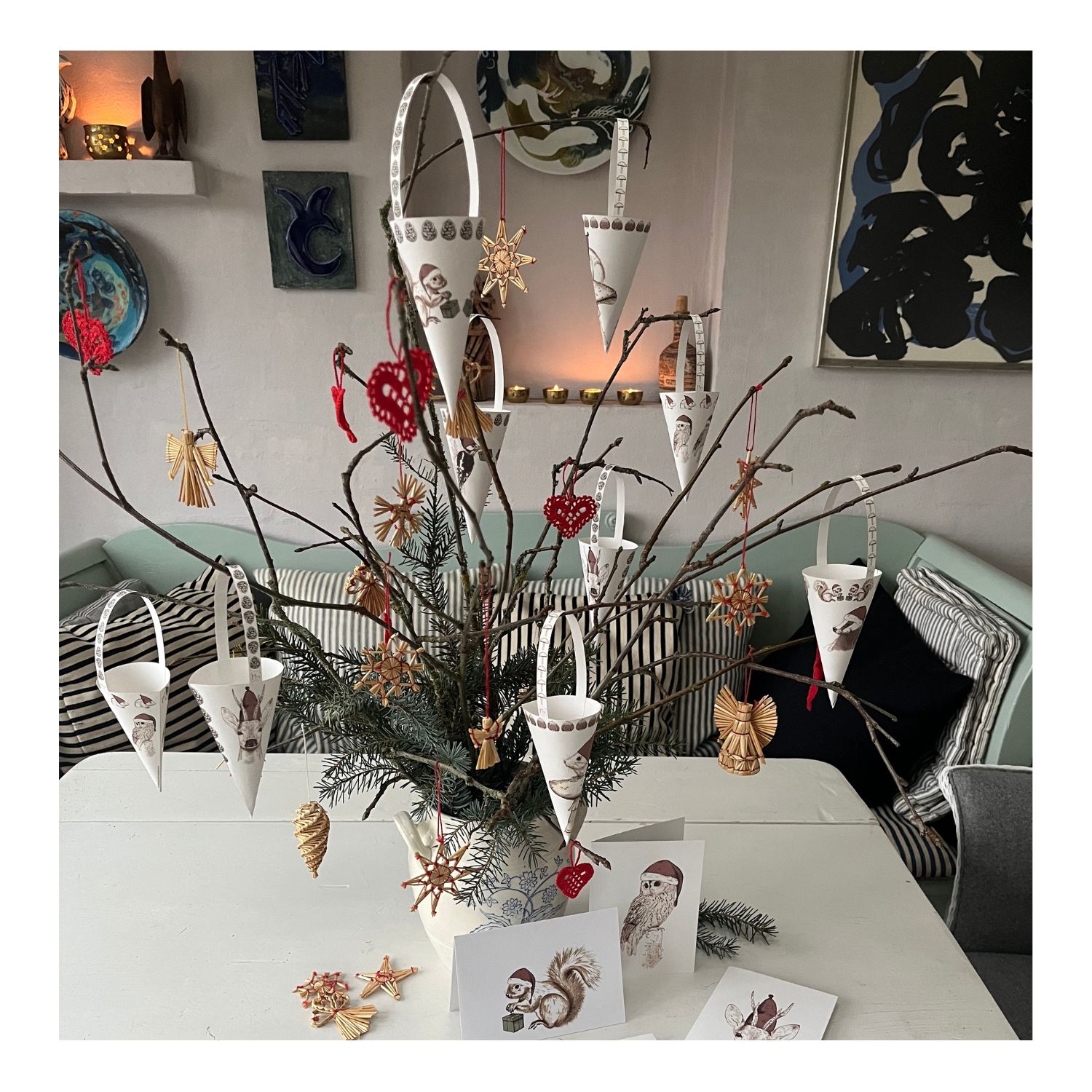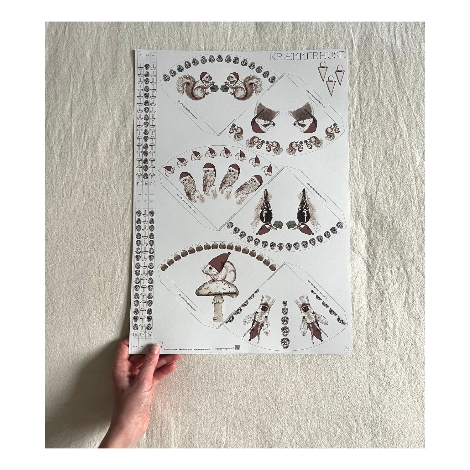 Det var de tre første ord, vi kom til at tænke på, da vi havde samlet de første kræmmerhuse. Dér sad vi ved bordet med saks og lim, og klippede og klistrede. De fine og sjove håndtegnede motiver og nostalgien ved juleklip skabte hygge og nærvær. Lige til at komme i ægte julestemning af! Dét vil vi gerne invitere dig og dine til også. Og altså… En lille skovmus med nissehue, som sidder på en svamp? Eller en søko med nissehue og julegave omgivet af søstjernedrys? Dét er da ikke til at stå for. Skab unik julepynt på gammeldags manér, som kan pynte på træet, i vinduet, i guirlanden – og måske vigtigst af alt: skab et rum for julehygge med dem, du holder af <3