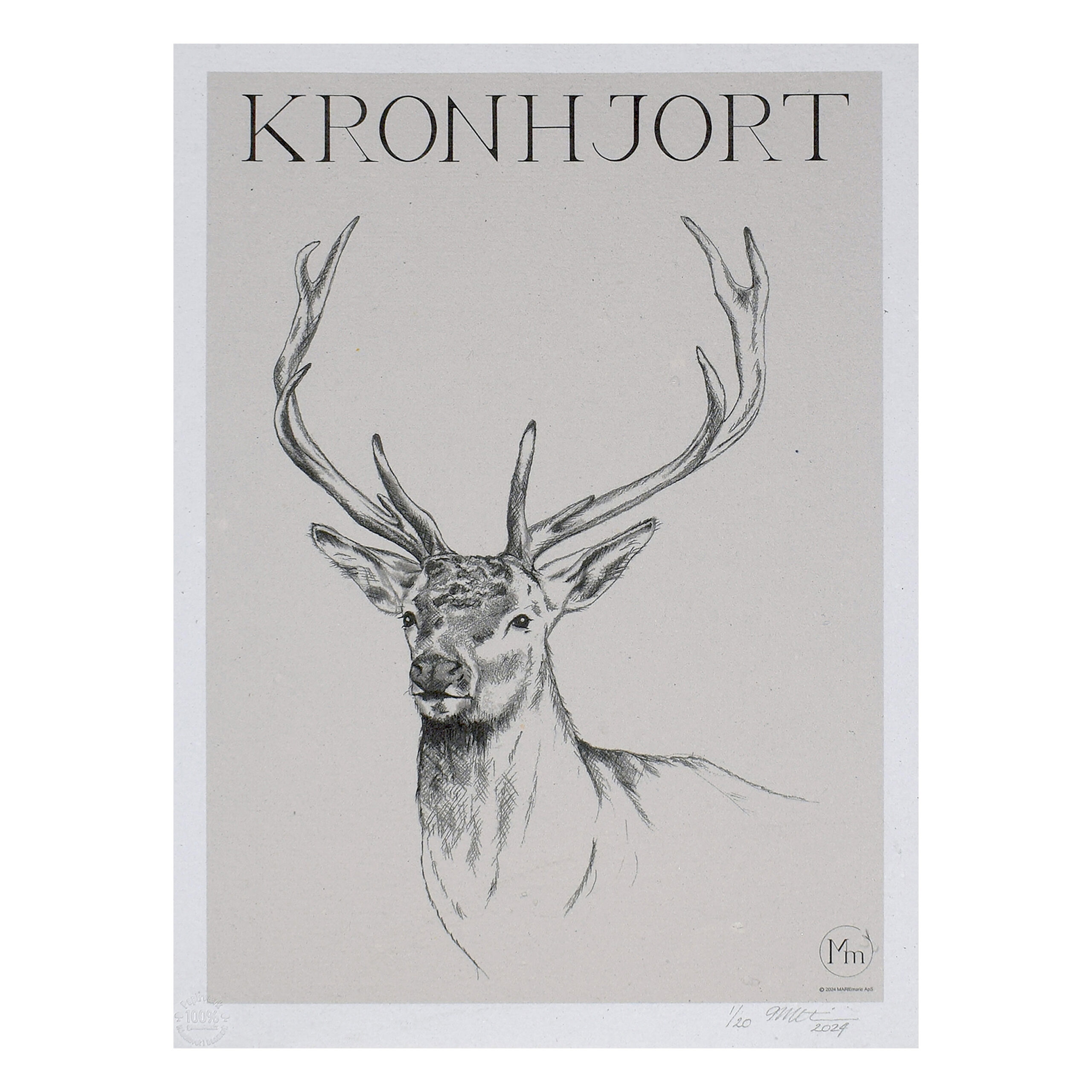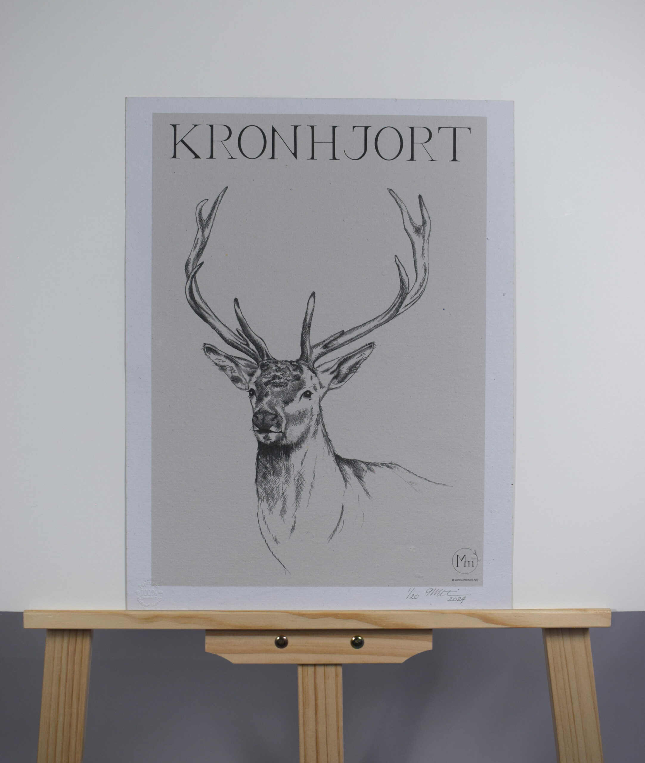 Limited edition kunsttryk af håndtegnet motiv: “Kronhjort”. Str. 30×40 cm.