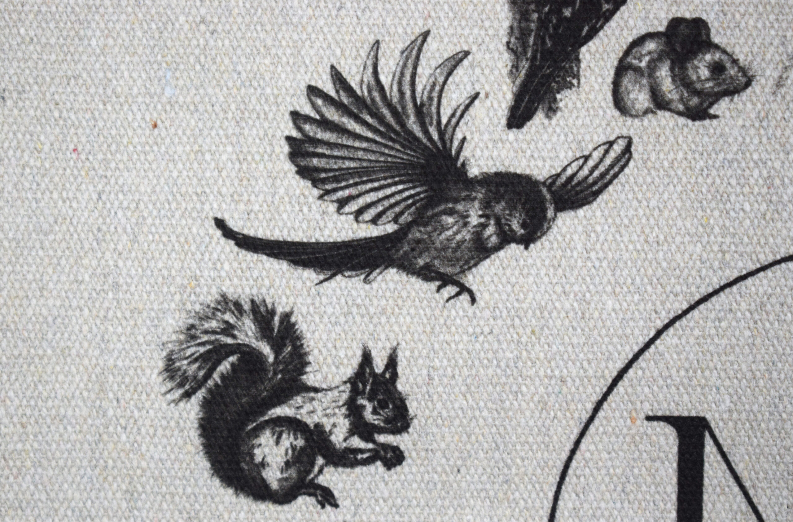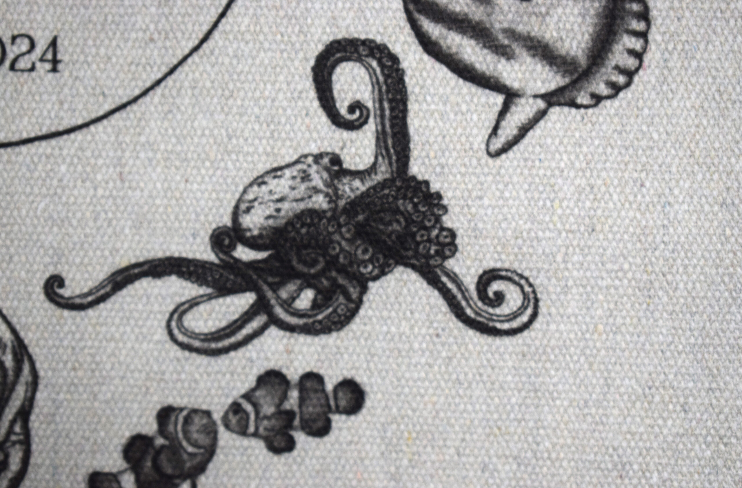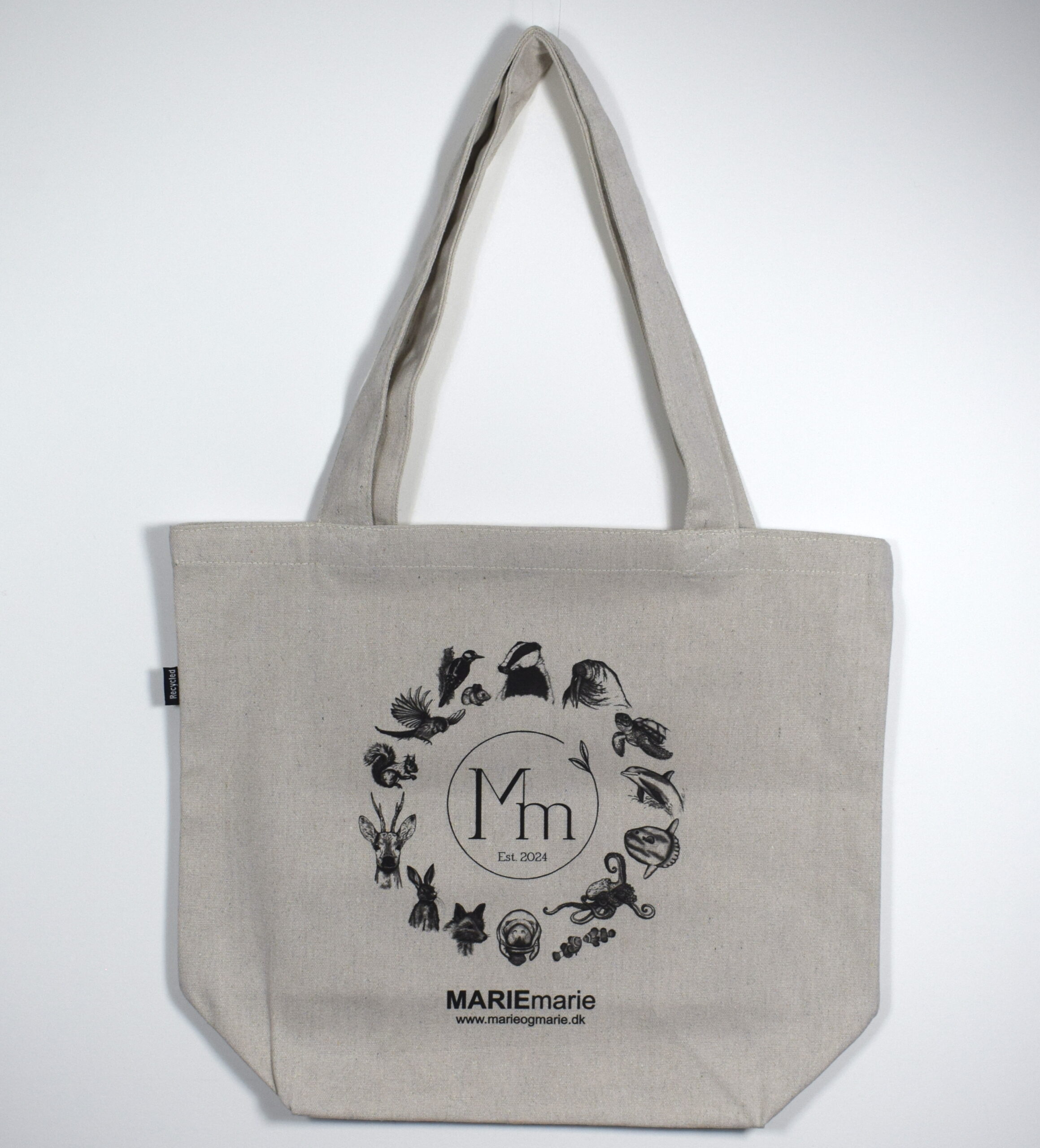 Motivet er vandbaseret transfertryk, trykt på muleposen i Danmark.